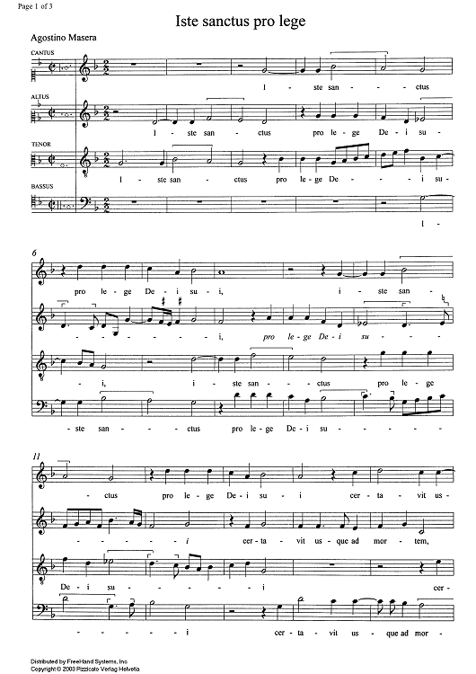 Digital Sheet Music for Iste sanctus pro lege - Score by , Agostino Masera scored for SATB Choir; id:351018