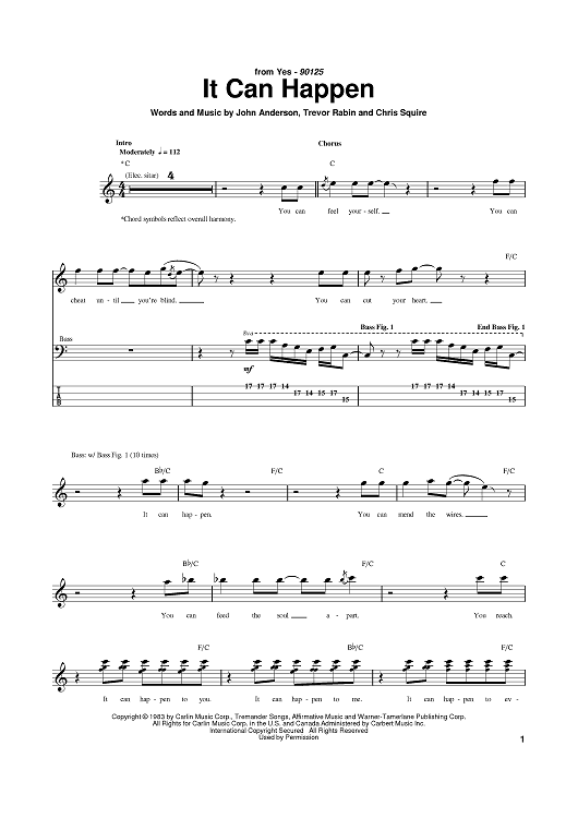 Digital Sheet Music for It Can Happen by Yes, Jon Anderson, Chris Squire, Trevor Rabin scored for Bass Tab; id:383058