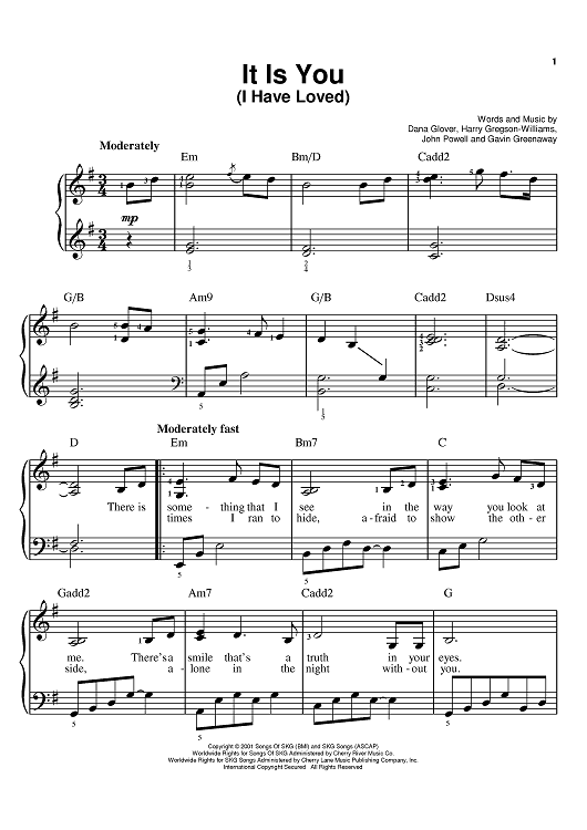 Digital Sheet Music for It Is You (I Have Loved) by Harry Gregson-Williams, Dana Glover, Gavin Greenaway scored for Easy Piano; id:369675