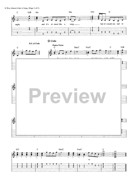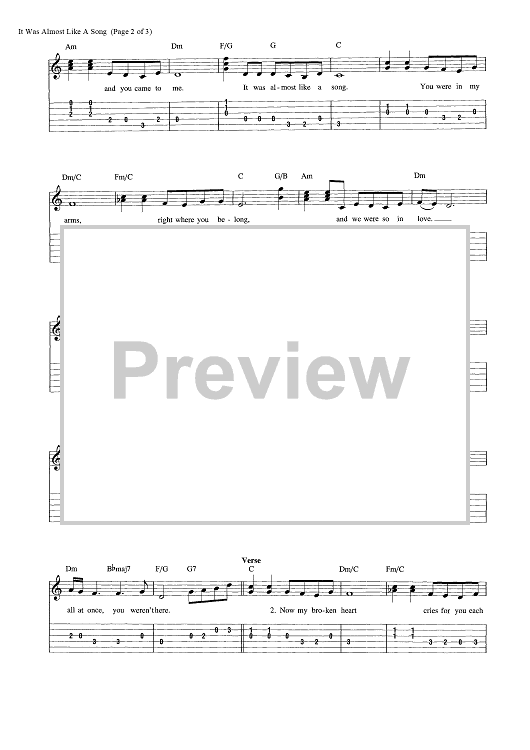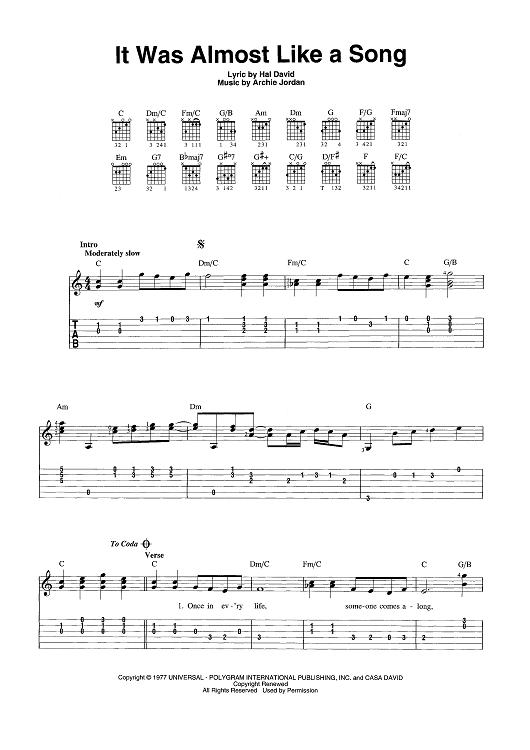 Digital Sheet Music for It Was Almost Like a Song by Hal David, Archie Jordan, Ronnie Milsap scored for Easy Guitar Tab/Vocal/Chords; id:456765