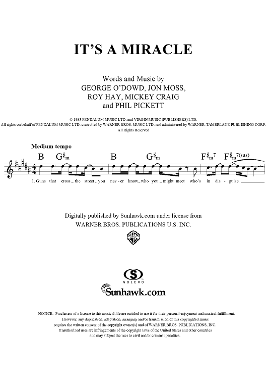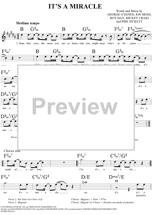 Digital Sheet Music for It's a Miracle by Boy George, Jon Moss, Roy Hay, Mikey Craig, Phil Pickett, Culture Club scored for Lead Sheet; id:191567