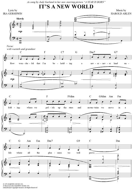 Digital Sheet Music for It's a New World by Harold Arlen, Judy Garland, Ira Gershwin scored for Piano/Vocal/Chords; id:321257