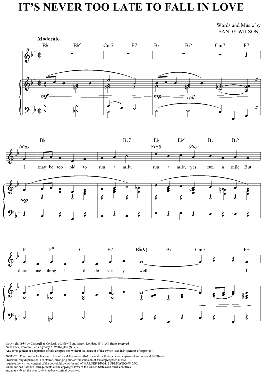 "It's Never Too Late to Fall in Love" Sheet Music by Sandy Wilson