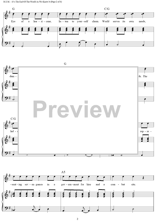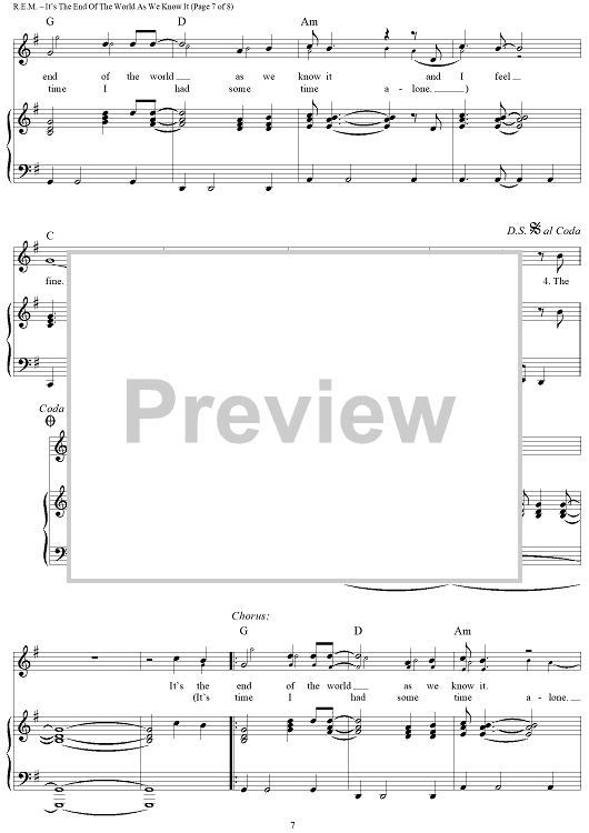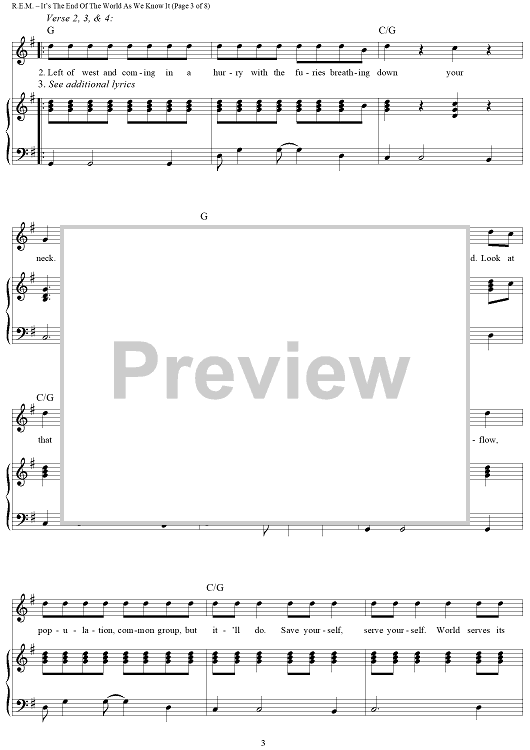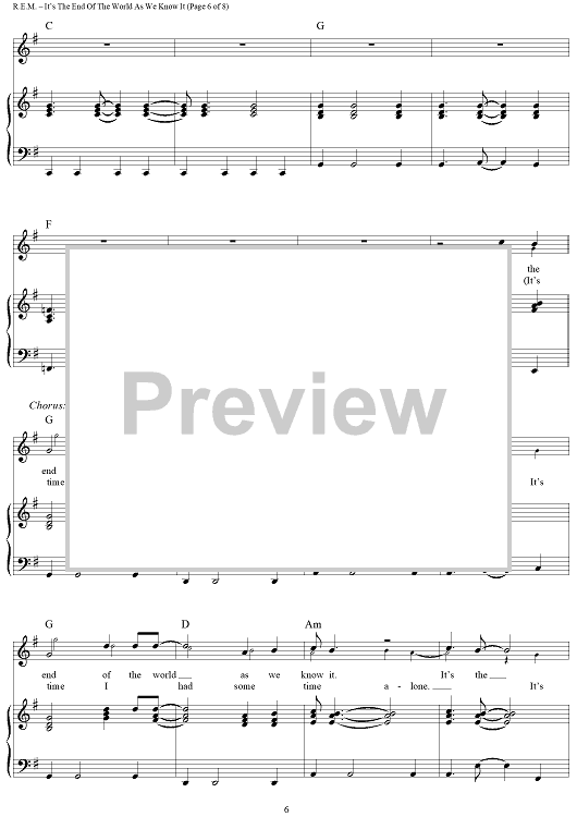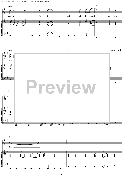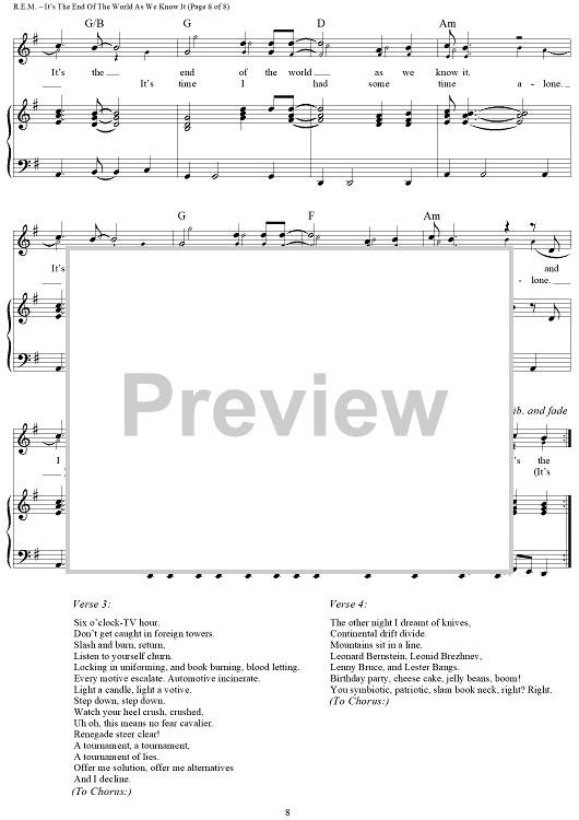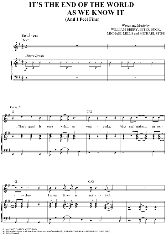 Digital Sheet Music for It's The End Of The World As We Know It (And I Feel Fine) by R.E.M., William Berry, Michael Stipe, Peter Buck, Mike Mills scored for Piano/Vocal/Chords; id:433124