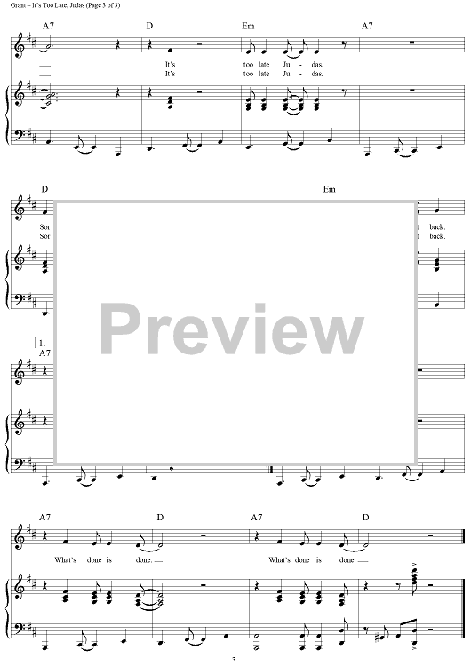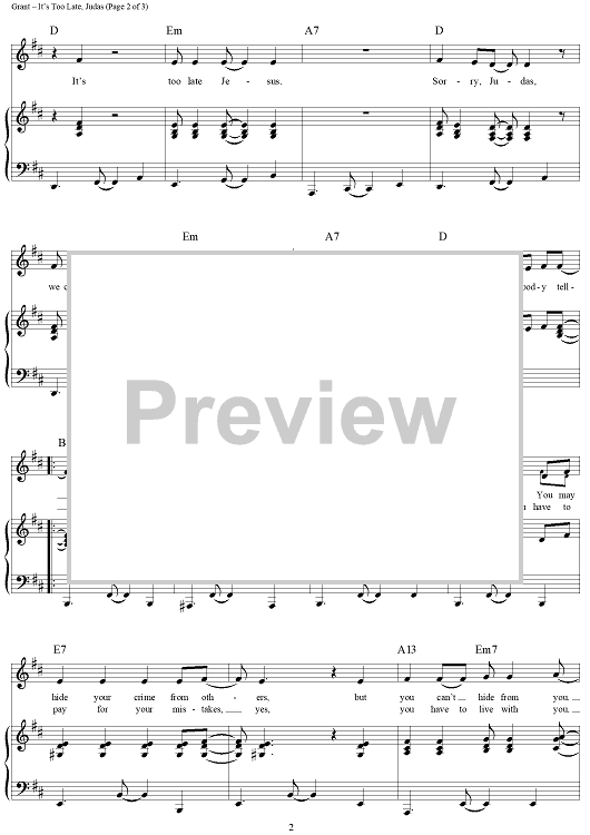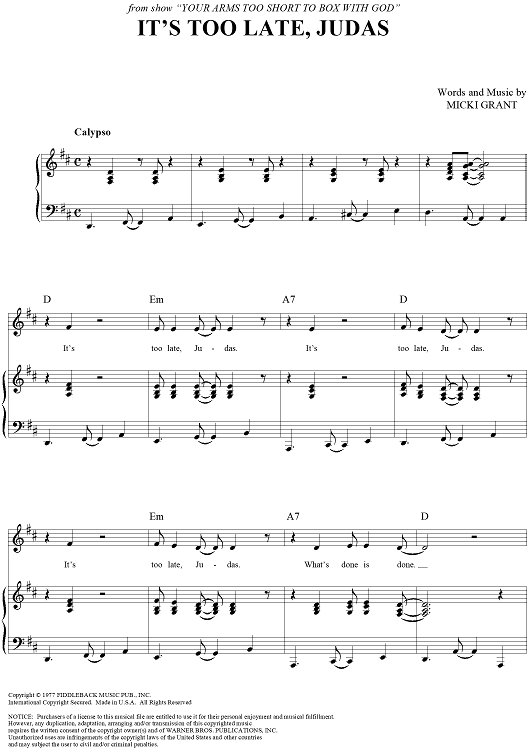 Digital Sheet Music for It's Too Late, Judas by Micki Grant scored for Piano/Vocal/Chords; id:267766