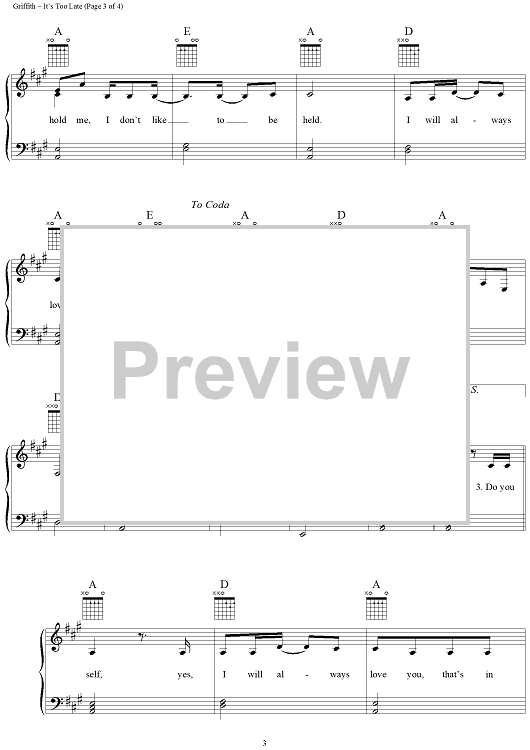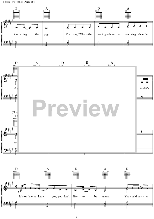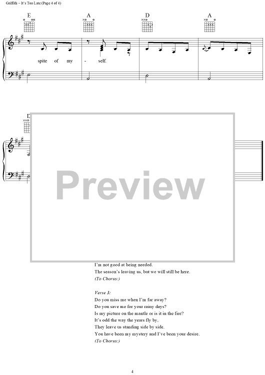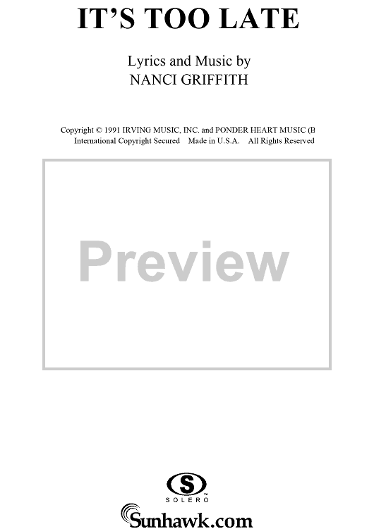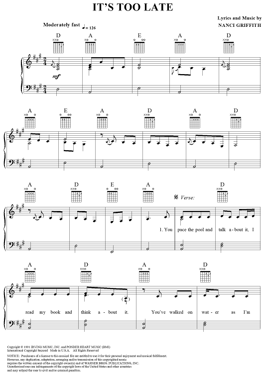 Digital Sheet Music for It's Too Late by Nanci Griffith scored for Piano/Vocal/Chords; id:267765