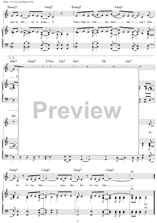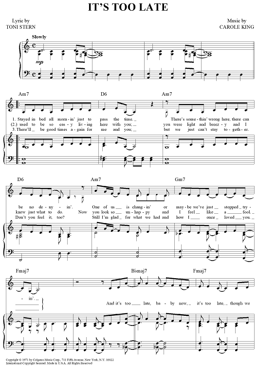 Digital Sheet Music for It's Too Late by Carole King, Toni Stern scored for Piano/Vocal/Chords; id:362950