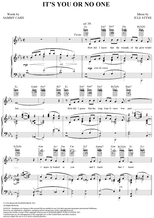 Digital Sheet Music for It's You or No One by Jule Styne, Sammy Cahn, Duke Ellington, Joe Williams scored for Piano/Vocal/Chords; id:259337