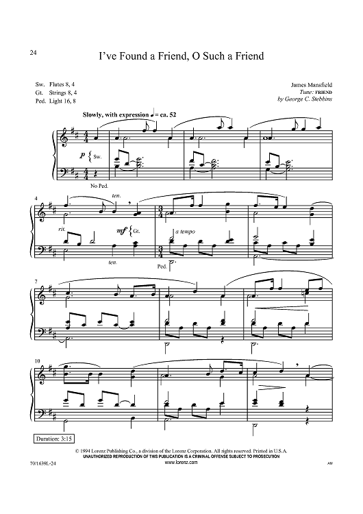 Digital Sheet Music for I’ve Found a Friend, O Such a Friend by George C. Stebbins, James Mansfield scored for Organ Solo; id:434016