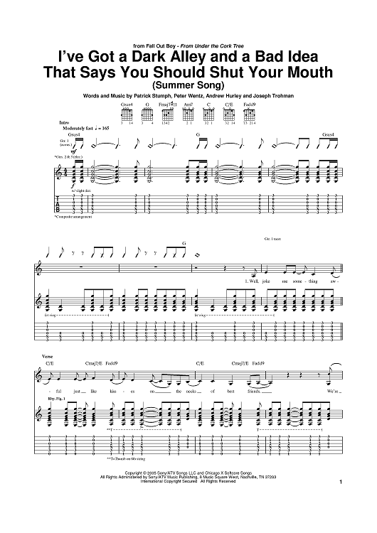 Digital Sheet Music for I've Got A Dark Alley And A Bad Idea That Says You Should Shut Your Mouth (Summer Song) by Patrick Stump, Peter Wentz, Andrew John Hurley, Joseph Trohman, Fall Out Boy scored for Guitar Tab; id:386338