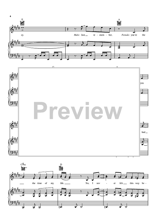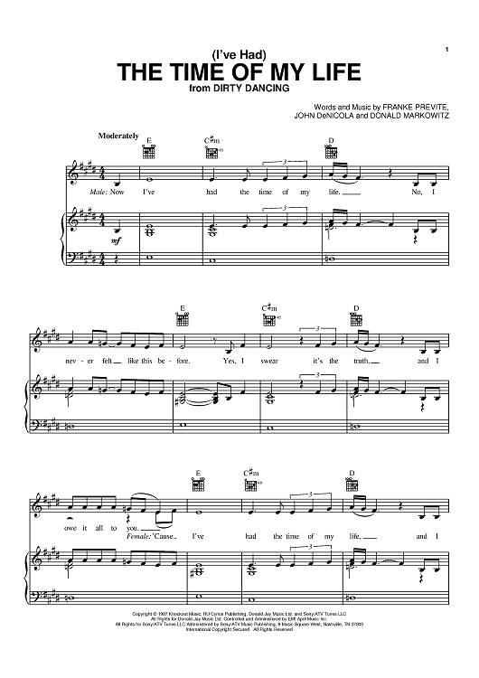 Digital Sheet Music for (I've Had) The Time Of My Life by Donald Markowitz, John DeNicola, Bill Medley, Franke Previte, Jennifer Warnes scored for Piano/Vocal/Chords; id:368718