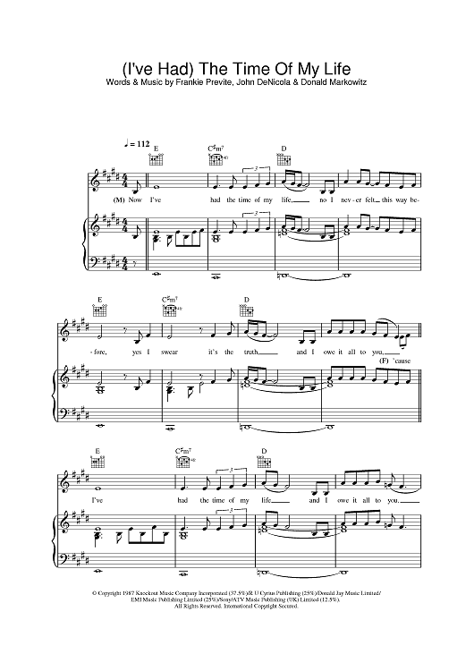 Digital Sheet Music for (I've Had) The Time Of My Life by Donald Markowitz, John DeNicola, Bill Medley, Franke Previte, Jennifer Warnes, Frankie Previte scored for Piano/Vocal/Chords; id:384162