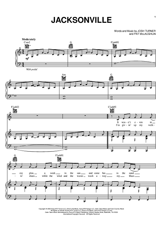 Digital Sheet Music for Jacksonville by Pat McLaughlin, Josh Turner scored for Piano/Vocal/Chords; id:374574