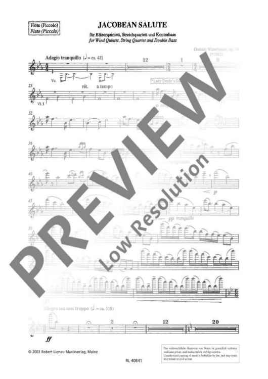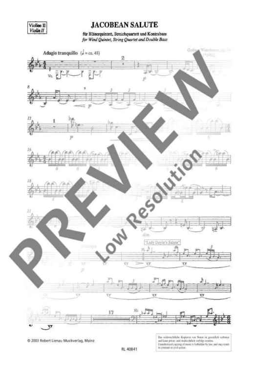 Jacobean Salute could be interpreted as a miniature symphony. Originally, a considerable part of the thematic material was intended for Scottish bagpipes which is why the B flat major bass pipes are still audible in certain parts. The glissandi of the strings, for instance, are meant to convey how the pipes are being blown through. The introductory motif is based on a lament from the 17th century. "Lady Doyle’s Salute“ whose melancholic mood penetrates the complete piece dates from the reign of James VI, King of Scotland (who would later become James I of England). The Scottish aspect of the composition is further emphasized and intensified by passages which resemble a Jig and a Reel (old Scottish dances).