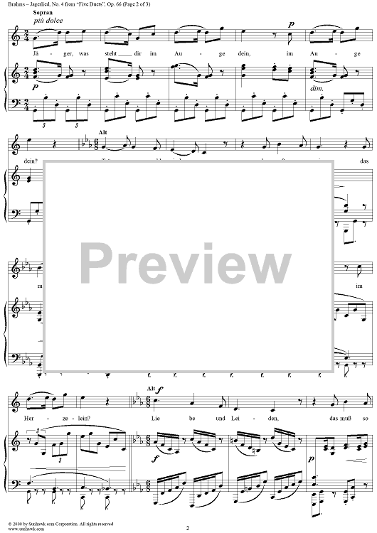 Digital Sheet Music for Jägerlied - No. 4 from "Five Duets" Op. 66 by , Johannes Brahms scored for Soprano/Alto/Piano; id:274961