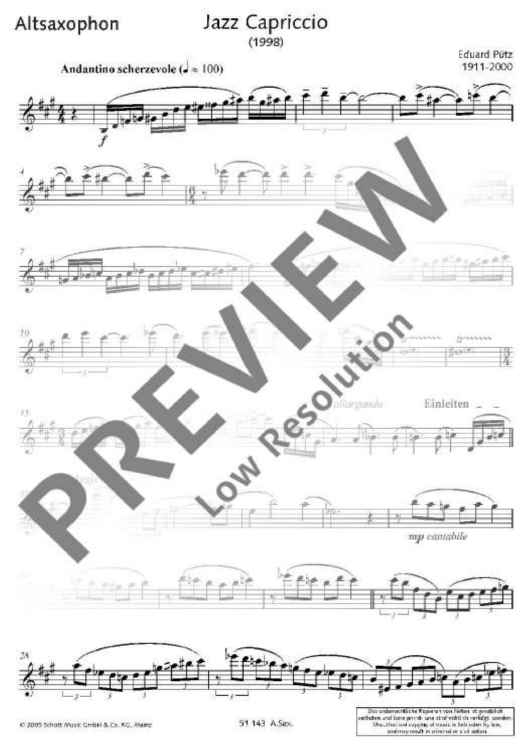 The composer Eduard Pütz (1911-2000) studied composition at the Musikhochschule in Cologne with Heinrich Lemacher, Hermann Schroeder, and Kaspar Roeseling. Later he worked as a teacher of theory at the Rheinische Musikschule in Cologne. His particular interest was in connecting serious with light music. 'Jazz Capriccio' is a cheerful piece with a 'composed-out' final cadence which, within the meaning of a jazz improvisation, can also be replaced by an improvisation of one's own. A rewarding piece for musicans interested in combining contemporary music with jazz.