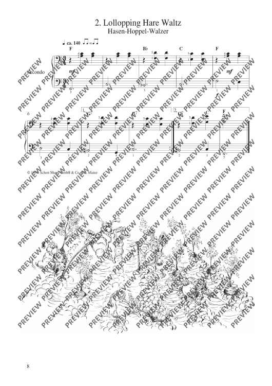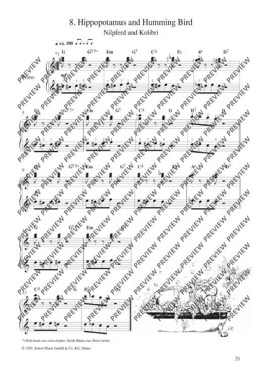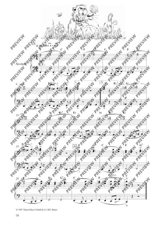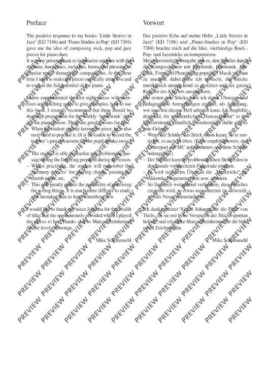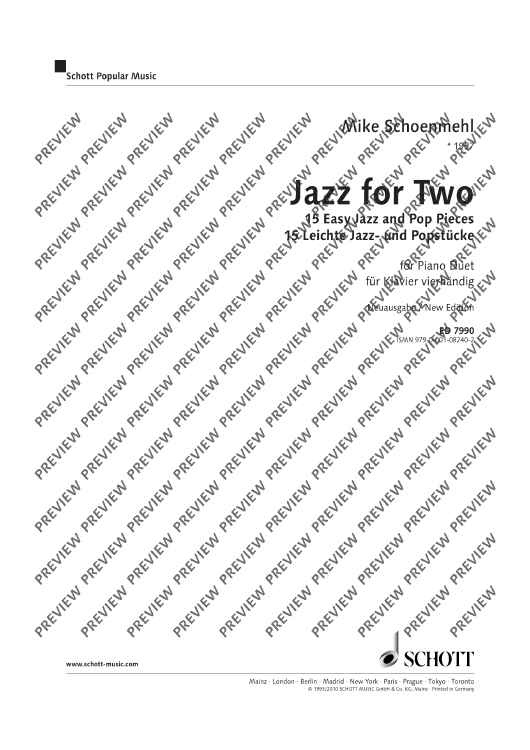 Adding to his two successful editions 'Little Stories in Jazz' (ED 7186) and 'Piano Studies in Pop' (ED 7304), Mike Schoenmehl wrote the collection 'Jazz for Two' for piano duet. Originally published in two volumes, the work was reedited in one volume in our new edition. Schoenmehl's commitment in the field of education to make rock, pop and jazz music accessible to pupils in a fun way shows here too: rhythm, harmony, melody, form and phrasing of popular music shall be imparted on the pupils by means of these fifteen entertaining jazz and pop pieces. Some of the pieces are even accompanied by exemplary exercises and educational remarks. Illustrated with funny drawings by Marcus Reinheimer.