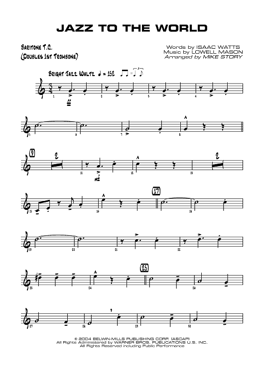 Digital Sheet Music for Jazz to the World - Baritone TC by Isaac Watts, Lowell Mason, Mike Story scored for Jazz Ensemble; id:358680