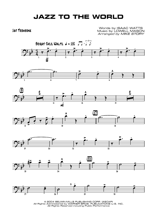 Digital Sheet Music for Jazz to the World - Trombone 1 by Isaac Watts, Lowell Mason, Mike Story scored for Jazz Ensemble; id:358676