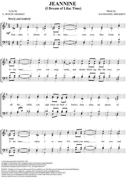Digital Sheet Music for Jeannine (I Dream of Lilac Time) by L. Wolfe Gilbert, Nathaniel Shilkret scored for Barbershop Quartet; id:120614