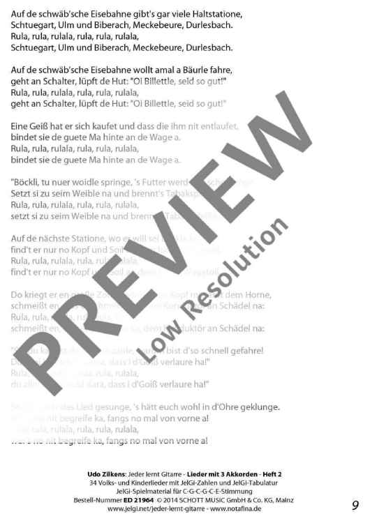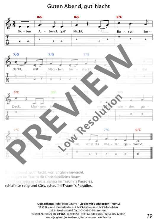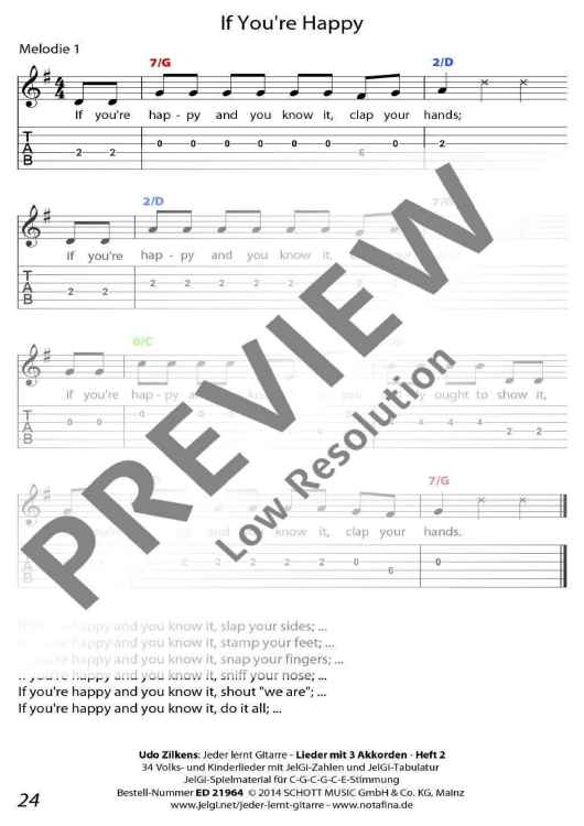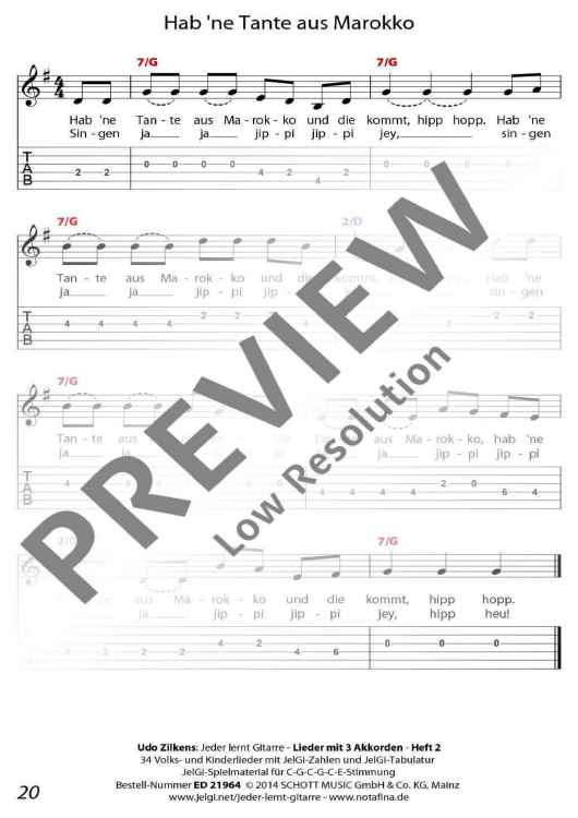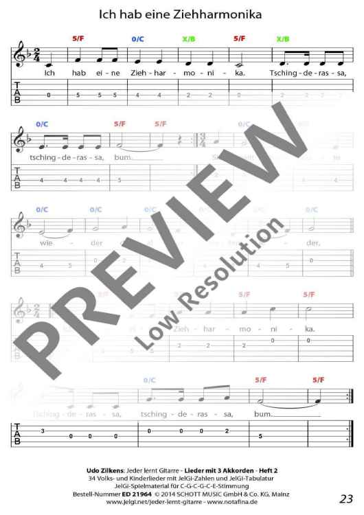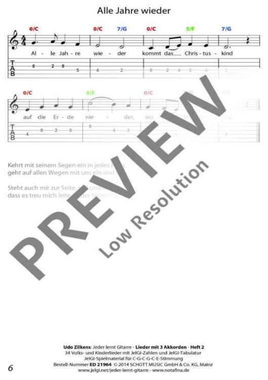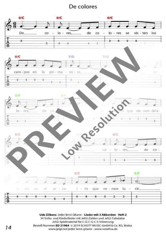 Die im In- und Ausland als Marke registrierte Methode "JelGi - Jeder lernt Gitarre" bietet alle Noten wahlweise für traditionelle Stimmung E-A-D-G-H-E oder für vereinfachte JelGi-Stimmung C-G-C-G-C-E an. Die farbigen JelGi-Zahlen entsprechen den Bünden bei der vereinfachten JelGi-Stimmung, die farbigen Akkordbuchstaben geben die traditionellen Gitarrengriffe an. Weitere Informationen zur JelGi-Methode sind unter www.jelgi.com zu finden.