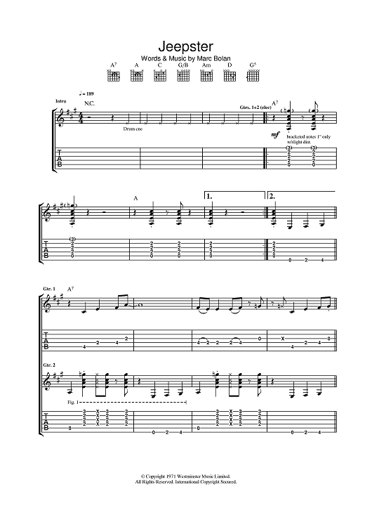 Digital Sheet Music for Jeepster by T.Rex scored for Guitar Tab; id:378664