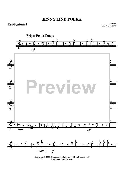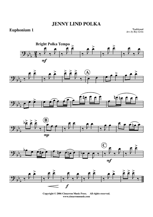 Digital Sheet Music for Jenny Lind Polka - Euphonium 1 BC/TC by Ray Grim, Traditional scored for Tuba Quartet; id:356553