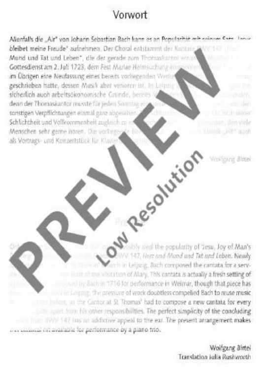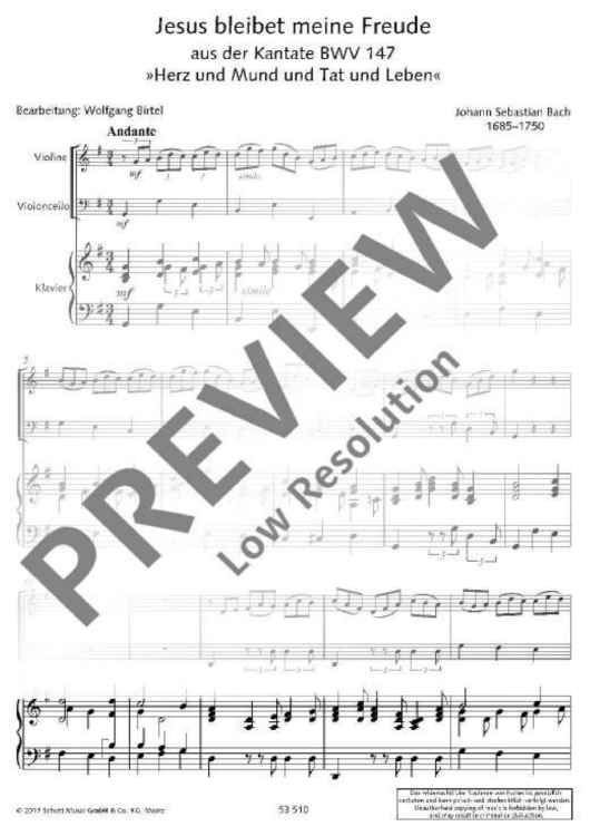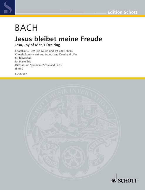 At best, it's the 'Air' by Johann Sebastian Bach that can rival his setting 'Jesus bleibet meine Freude' in popularity: The final chorus from the Cantata BWV 147 'Herz und Mund und Tat und Leben' has become a really catchy tune, thanks to its simplicity and perfection, of which one can hardly get enough. This arrangement of this highlight of classical music is now perfectly suitable as a performance and concert piece for piano trio.