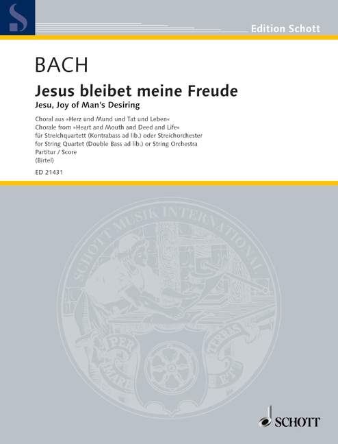Allenfalls die „Air“ von Johann Sebastian Bach kann es an Popularität mit seinem Satz „Jesus bleibet meine Freude“ aufnehmen: Der Schlusschor aus der Kantate BWV 147 „Herz und Mund und Tat und Leben“ ist in seiner Schlichtheit und Vollkommenheit zugleich zu einem wahren „Ohrwurm“ geworden, an dem man sich kaum satt hören kann. Diese Bearbeitung macht dieses Klassik-Highlight auch als Vortrags- und Konzertstück für Streichquartett mit Kontrabass ad libitum oder Streichorchester zugänglich.