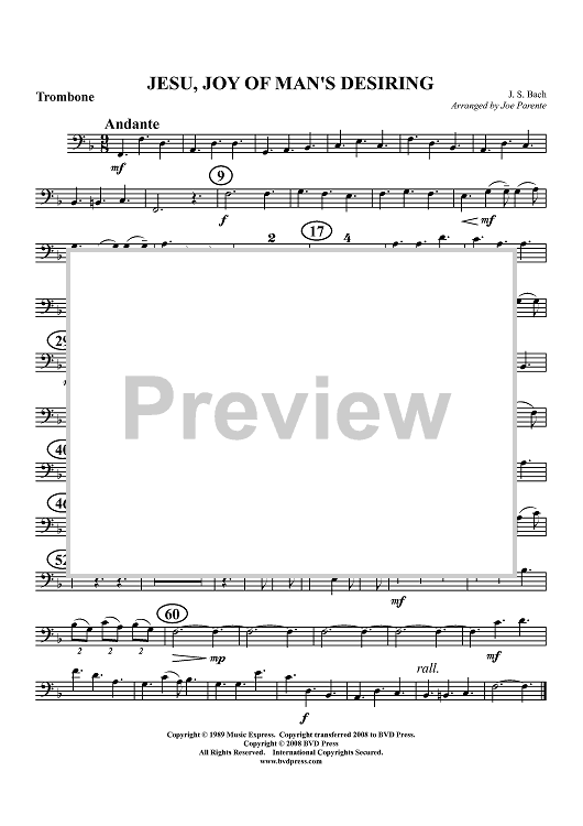 Digital Sheet Music for Jesu, Joy of Man's Desiring - Trombone by Johann Sebastian Bach, Joe Parente scored for Brass Quintet; id:405047