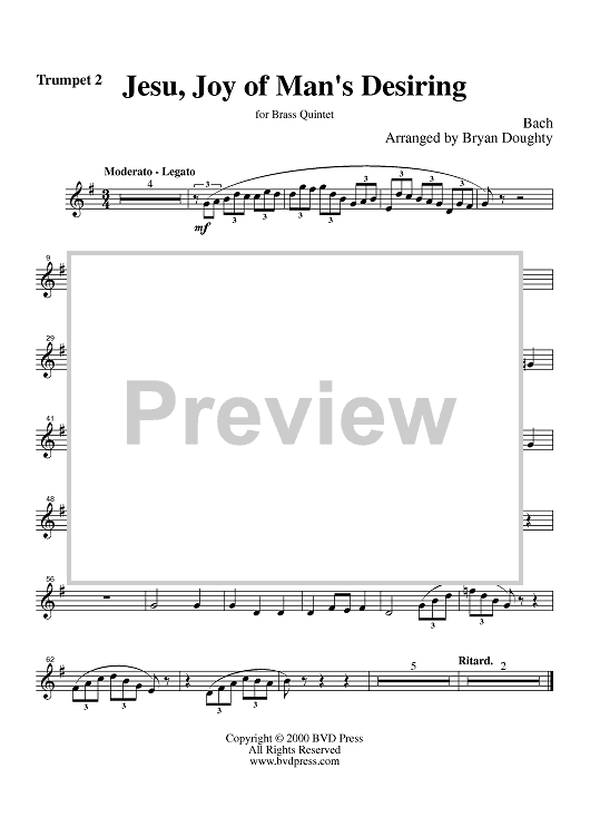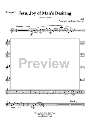 Digital Sheet Music for Jesu, Joy of Man's Desiring - Trumpet 2 by , Bryan Doughty, Johann Sebastian Bach scored for Brass Quintet; id:314026
