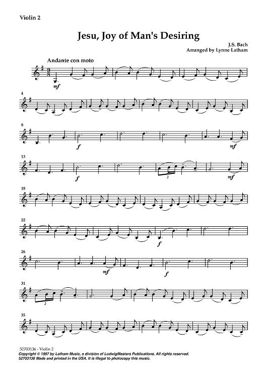 Digital Sheet Music for Jesu, Joy of Man's Desiring - Violin 2 by , Johann Sebastian Bach, Lynne Latham scored for String Quartet; id:449703