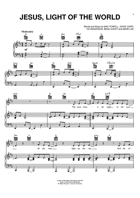 Digital Sheet Music for Jesus, Light Of The World by Third Day, Mac Powell, Mark David Lee, Tai Anderson, Brad Avery, David Carr scored for Piano/Vocal/Chords; id:401046