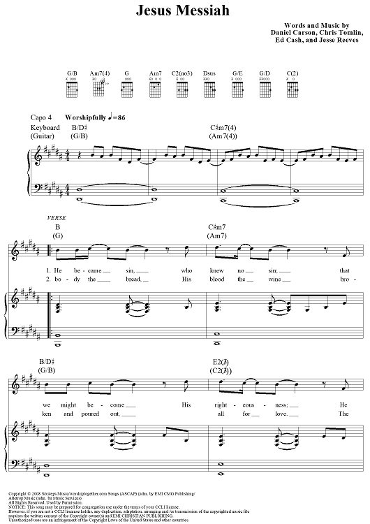 Digital Sheet Music for Jesus Messiah by Chris Tomlin, Jesse Reeves, Ed Cash, Daniel Carson scored for Piano/Vocal/Chords; id:404406