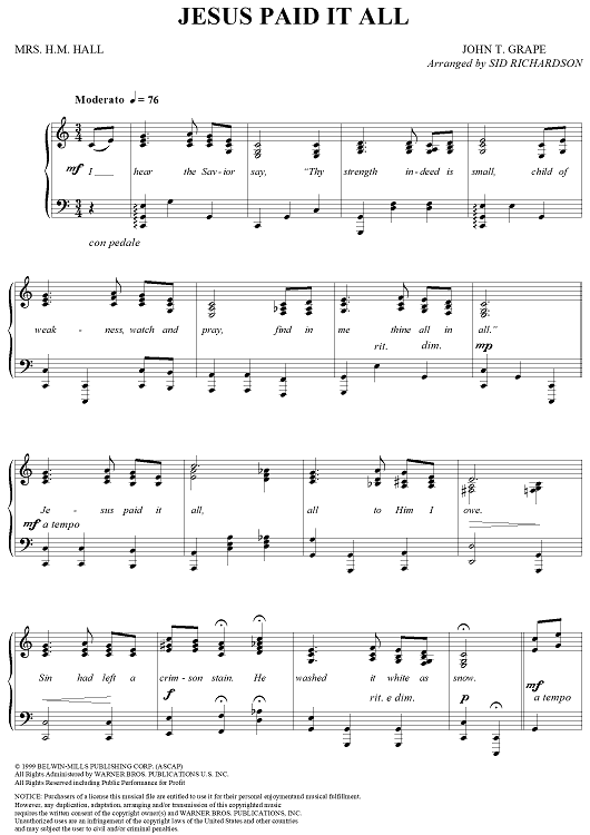 "Jesus Paid It All" Sheet Music by John T. Grape