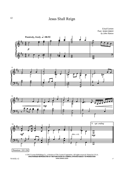 Digital Sheet Music for Jesus Shall Reign by Lloyd Larson, John Hatton scored for Piano Solo; id:434925