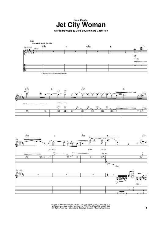 Digital Sheet Music for Jet City Woman by Chris DeGarmo, Queensrÿche, Geoff Tate scored for Guitar Tab; id:380490