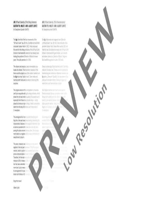 The Jig is the first of the four movements of the “St Paul’s Suite” (op.29, No. 2) written by the British composer Gustav Holst in 1912. Holst composed this work for the string orchestra of the St Paul’s Girls’ School in Hammersmith where he had already been holding the position of Director of Music for seven years. The suite premiered in 1913. This vibrant and vivacious piece immediately captivates the listener. The folcloristic character of the theme and the playful use of the motivic material turn the Jig into a truly “catchy tune”. Even meter and harmony both hold a whole series of charming little surprises. The original version of the composition is characterized by an exquisite setting for string orchestra, which draws the rich and mellow quality of its overall sound especially from those many double stops – mostly played as drones on open strings. Holst’s composition starts from the key of D dorian and finally ends in C mixolydian. The arrangement on hand converts the string setting into a five-part saxophone setting, translating the characteristic features of the original’s folcloristic style as best as possible to the new tone color. By transposing the piece one whole-tone down, the arrangement starts in a register which is very comfortable for saxophones to play in. The piece, however, would end up in a key and/or register in the last part (measure 170 of the original version), which could not be mastered by the saxophone instrumentation chosen for this arrangement. Therefore, the five-bar modulation leading from measure 165 to measure 169 in the original composition has been extended – true to Holst’s style – by two more bars (up to measure 171). This way, the Jig in its arrangement for saxophone quintet now starts in C dorian but finishes in G mixolydian.