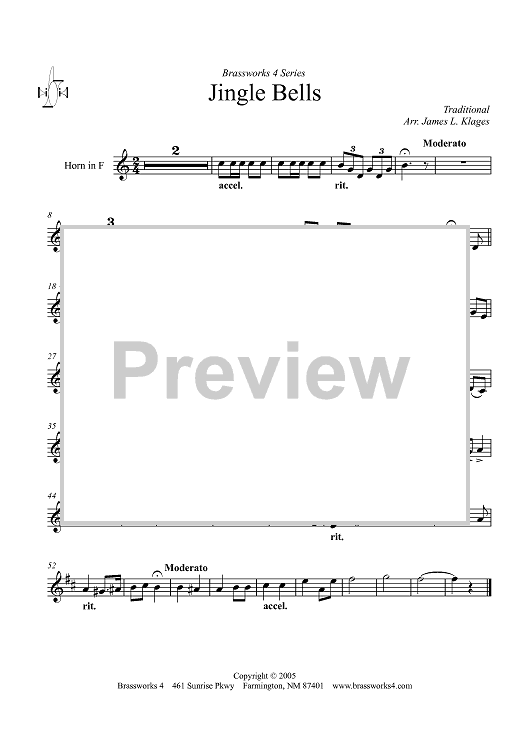 Digital Sheet Music for Jingle Bells - Horn in F by James Klages, Traditional scored for Brass Quintet; id:357947