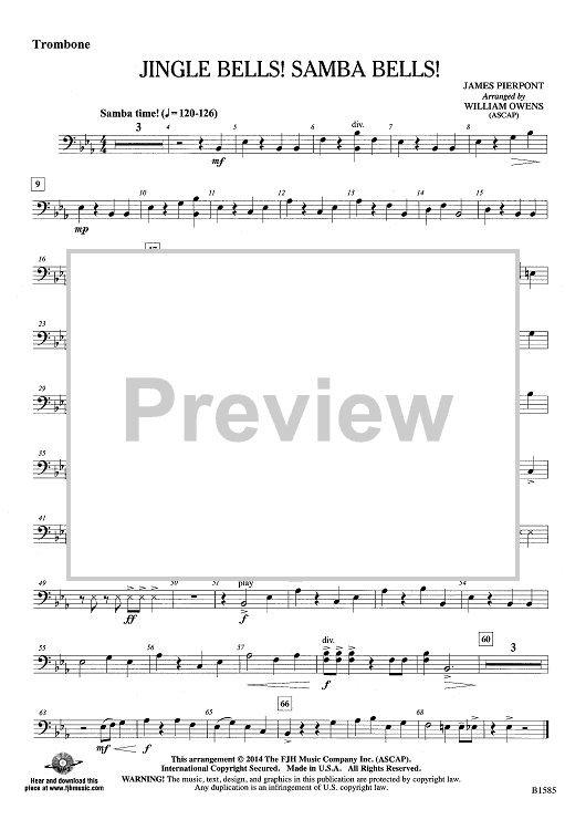 Digital Sheet Music for Jingle Bells! Samba Bells! - Trombone by James Pierpont, William Owens scored for Concert Band; id:443402