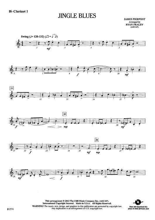Digital Sheet Music for Jingle Blues - Bb Clarinet 1 by James Pierpont, Ryan Fraley scored for Concert Band; id:442262