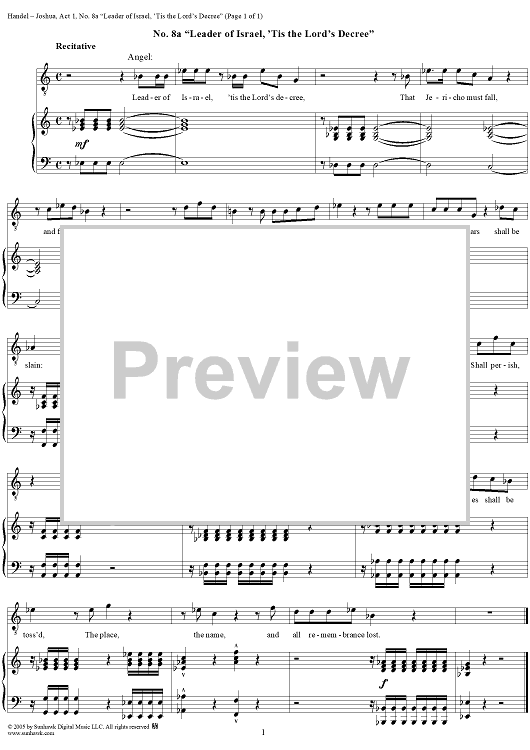Digital Sheet Music for Joshua, Act 1, No. 8a "Leader of Israel, 'tis the Lord's decree" by George Frideric Handel scored for Vocal Score; id:306676