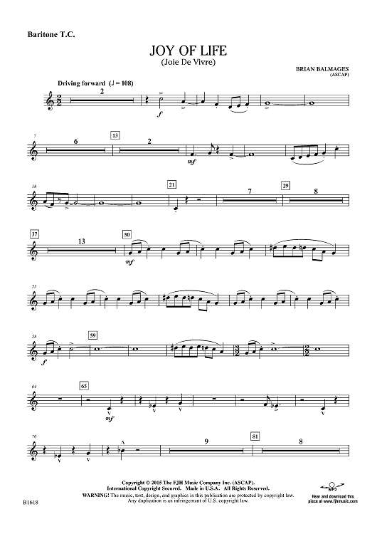 Digital Sheet Music for Joy of Life (Joie de Vivre) - Baritone TC by Brian Balmages scored for Concert Band; id:454561