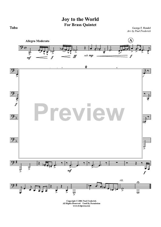 Digital Sheet Music for Joy to the World - Tuba by George Frideric Handel, Paul Frederick scored for Brass Quintet; id:314050