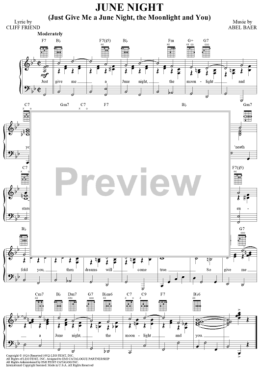 Digital Sheet Music for June Night (Just Give Me a June Night, the Moonlight and You) by Cliff Friend, Abel Baer scored for Piano/Vocal/Chords; id:276246