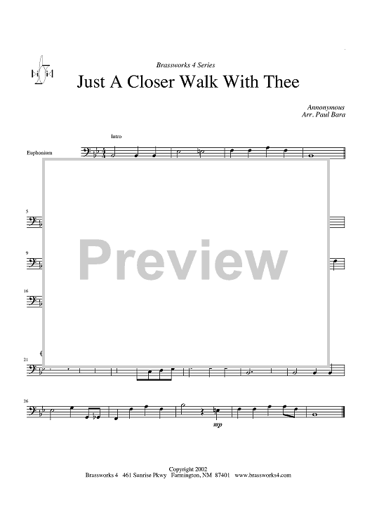 Digital Sheet Music for Just a Closer Walk with Thee - Euphonium by Unknown Writer, Paul Bara scored for Brass Quartet; id:316918