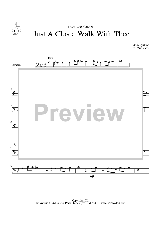 Digital Sheet Music for Just a Closer Walk with Thee - Trombone by Unknown Writer, Paul Bara scored for Brass Quartet; id:316916