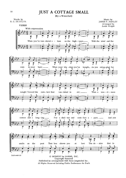 Digital Sheet Music for Just A Cottage Small (By the Waterfall) by James F. Hanley, Buddy DeSylva, Leola Wright scored for Barbershop Quartet; id:423851