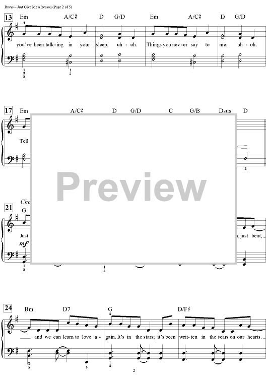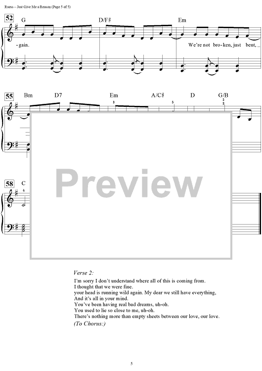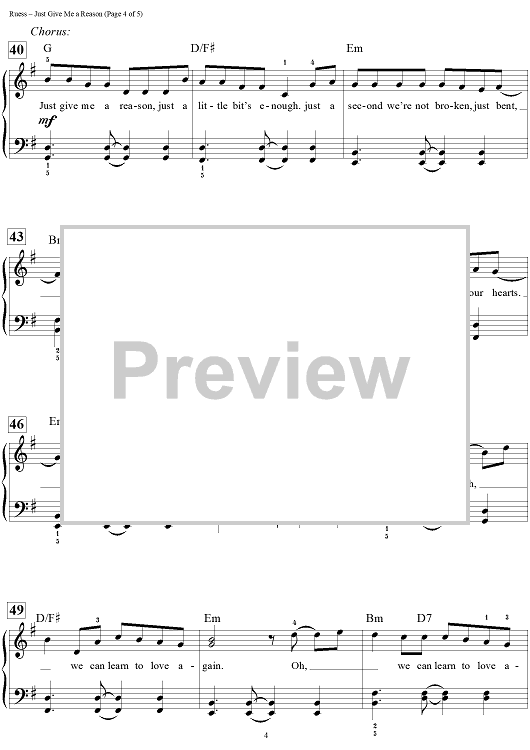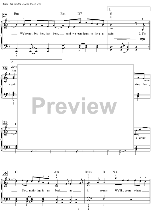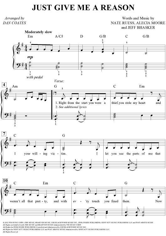 Digital Sheet Music for Just Give Me A Reason by Dan Coates, Alicia B. Moore, Pink, Jeffrey Bhasker, Nate Ruess scored for Easy Piano/Vocal/Chords; id:440090