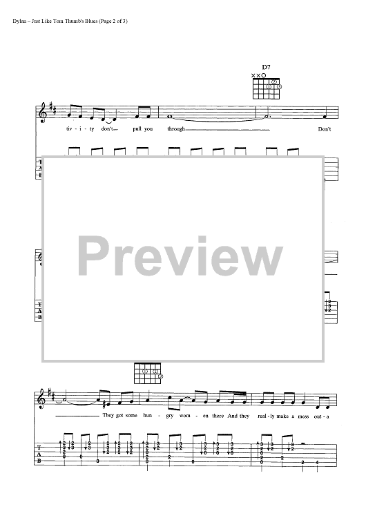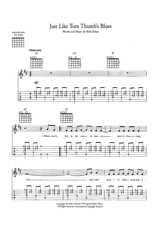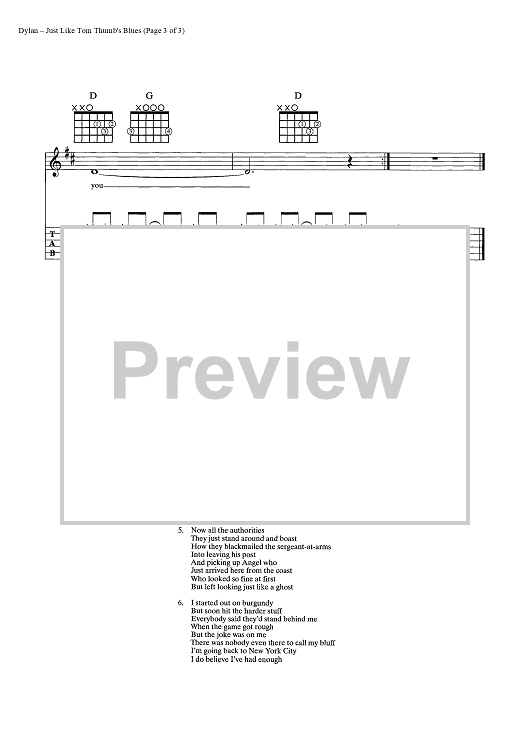 Digital Sheet Music for Just Like Tom Thumb's Blues by Bob Dylan scored for Guitar Tab/Vocal/Chords; id:445389
